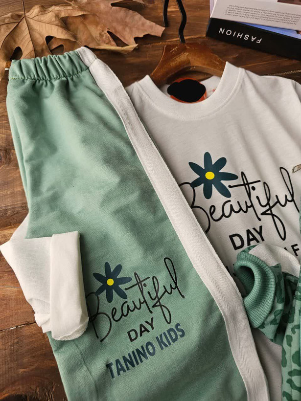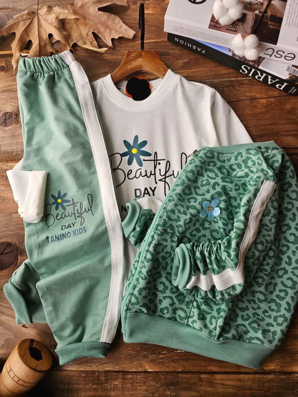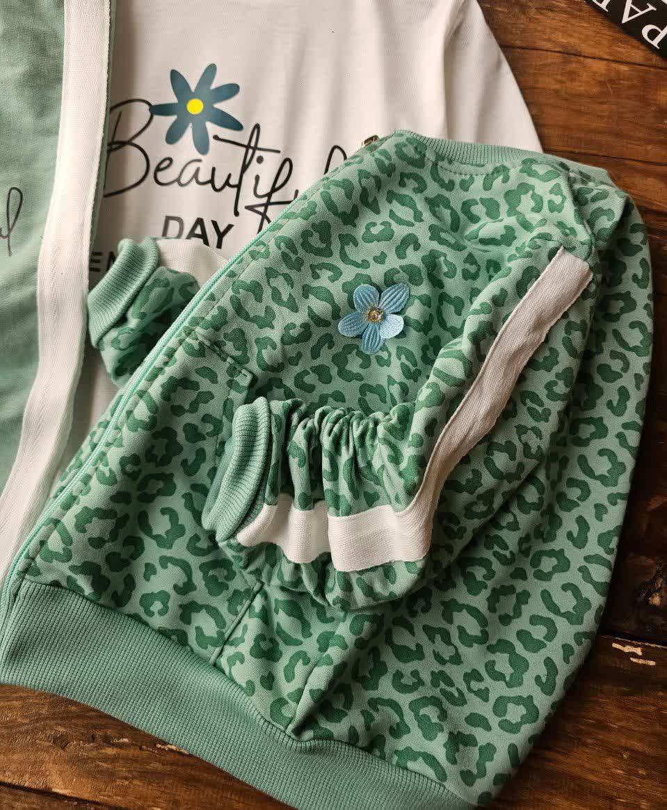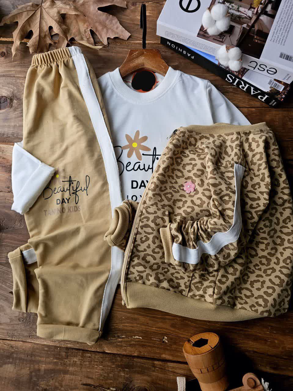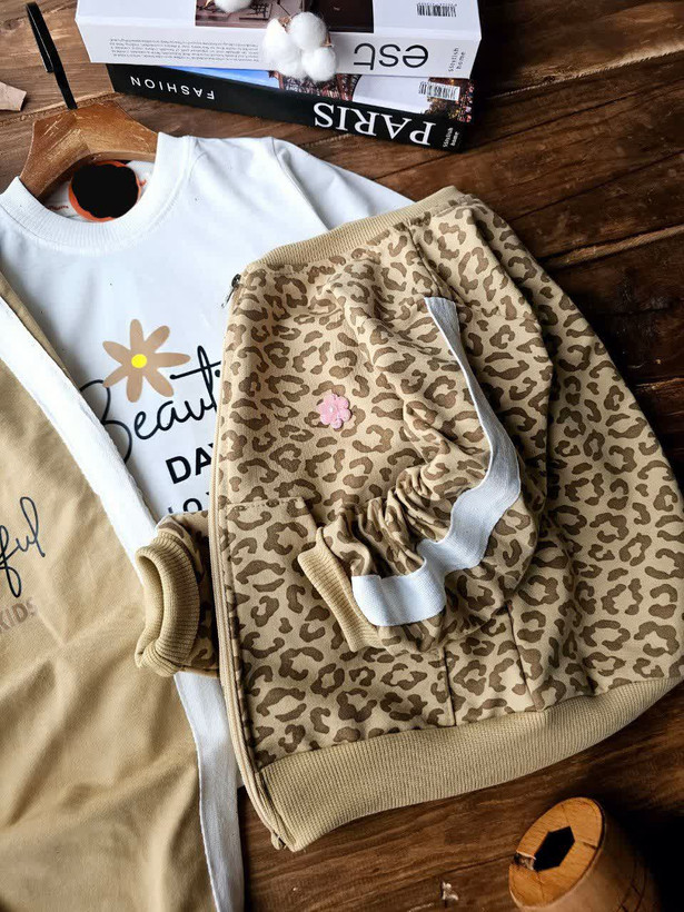 سه تیکه سویشرت شلوار پلنگی دخترانه اقتصادی سایز بندی 50 55 60 65